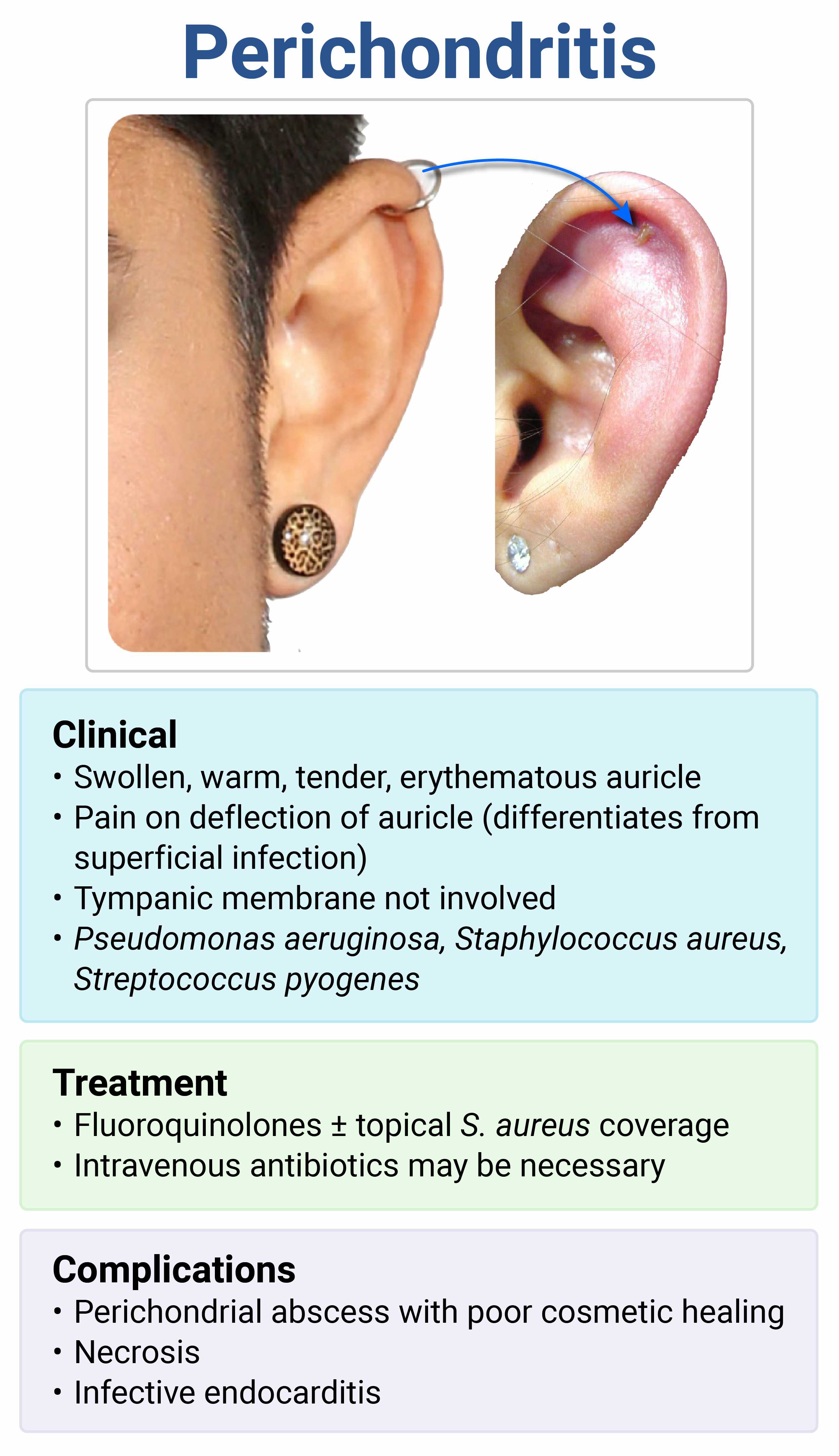 Perichondritis is an infection of the cartilage of the ear. It is commonly caused by trauma, with ear piercings as a common etiology. Patients will present with erythema, swelling, and severe pain to palpation and manipulation of the ear. The diagnosis can be made clinically. The most common causative organisms of perichondritis include Pseudomonas aeruginosa, Staphylococcus aureus, and Streptococcus pyogenes. Outbreaks of P. aeruginosaperichondritis have been associated with spring-loaded piercing guns. Treatment is commonly a fluoroquinolone (such as ciprofloxacin) as well as consideration of coverage for Staphylococcus aureus (such as mupirocin). Piercings should be removed, and aftercare solutions should be stopped due to previous reports of bacterial contamination. Early, appropriate treatment mitigates complications such as abscess, necrosis, and poor cosmetic appearance caused by the infection.