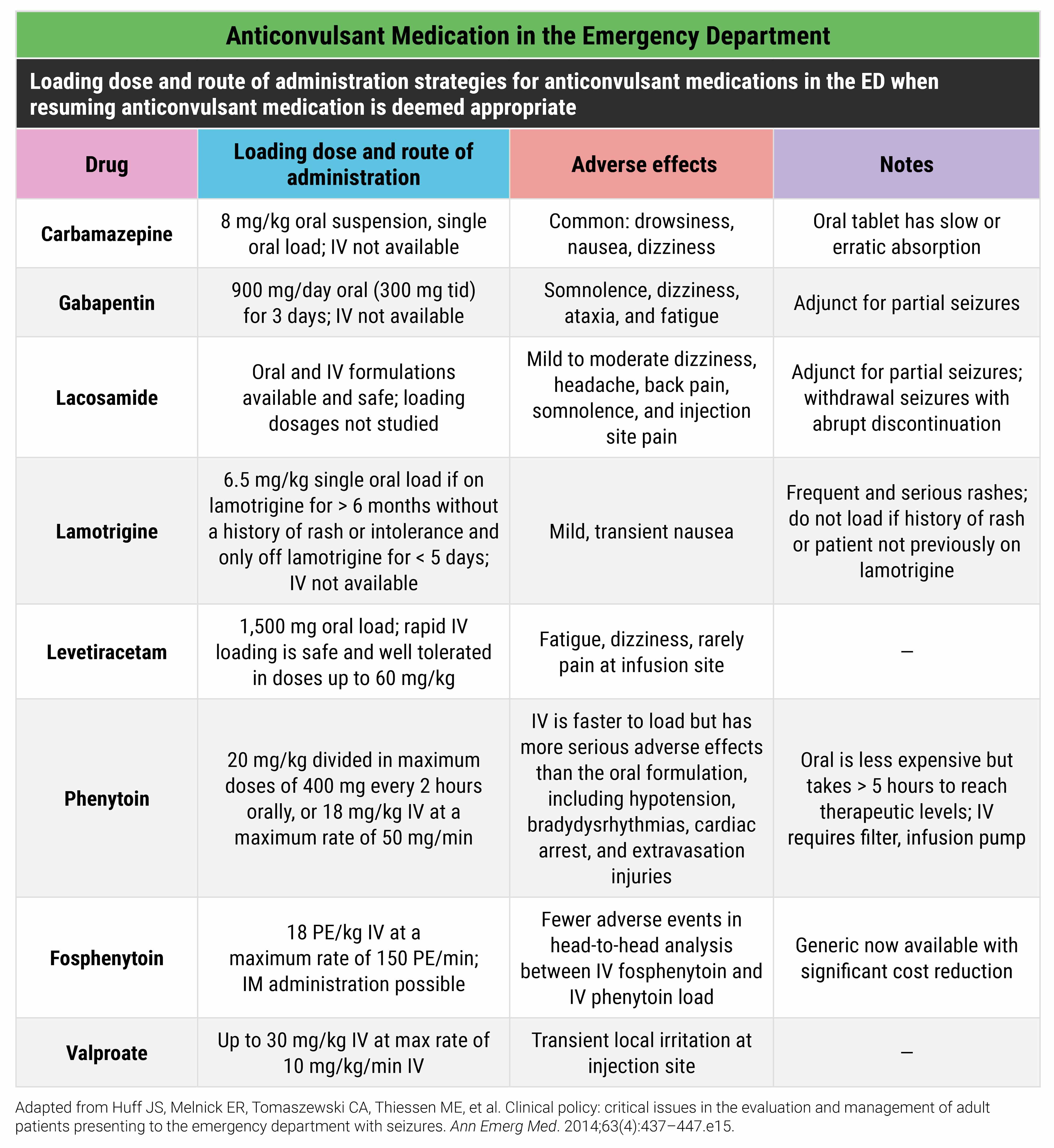 Treatment of patients with seizures should include airway monitoring and protection from injuries related to seizures. The patient should be placed in the lateral decubitus position to reduce aspiration risk. Benzodiazepines are recommended as first-line medications. Second-line therapies include valproic acid, phenytoin, fosphenytoin, and levetiracetam.